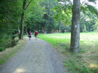 "Nach dem gestrigen Regen ist es Morgens sehr klar und angenehm zu gehen. Aber bald verändert sich das Wetter. Hohe Luftfeuchtigkeit und Schwüle sind die Folge. Lange Allen, sehr lange Allen und einsame Straßen erwarten uns. Dazu viele Teerstraßen. Plötzlich fehlt unser Wegzeichen, die Jakobsmuchel. Wir haben uns verlaufen. Aber unsere Kreativabteilung der Gruppe findet sich bald wieder zurecht."