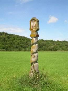 "Der Regen hat sich noch nicht verzogen, aber ein kräftiges Frühstück und das Vorland der Rhön verliert seinen Schrecken. Die abwechslungsreiche Landschaft muss aber trotzdem erst bezwungen werden. Am Naturschutzgebiet, dem 'Reichen Mädchen von Molzbach' (Hünengrab)und einer modernen Strafanstalt pilgern wir vorbei und schon kommt Hünfeld in Sicht.