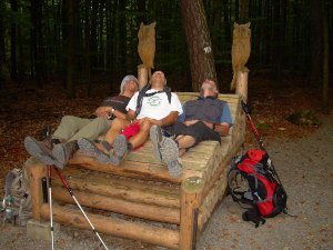 Im anregenden Gespräch wird schon die eine oder andere Jakobsmuschel der Wegmarkierung übersehen. Bei unbezeichneten Waldwegen kommen einige Kilometer zusammen. Bis zum Heiliegenhof in Bad Kissingen sind ca. 40 Kilometer Tagesleistung erreicht. Die Sonne hat sich versteckt und es ist ziemliches Bleigrau. Mit dem morgendlichen Reisesegen hatte es heute nicht geklappt. Deshalb ist diese Etappe bestimmt etwas länger geworden? Nach dem obligatorischen Radler sieht die Welt schon wieder freundlicher aus.